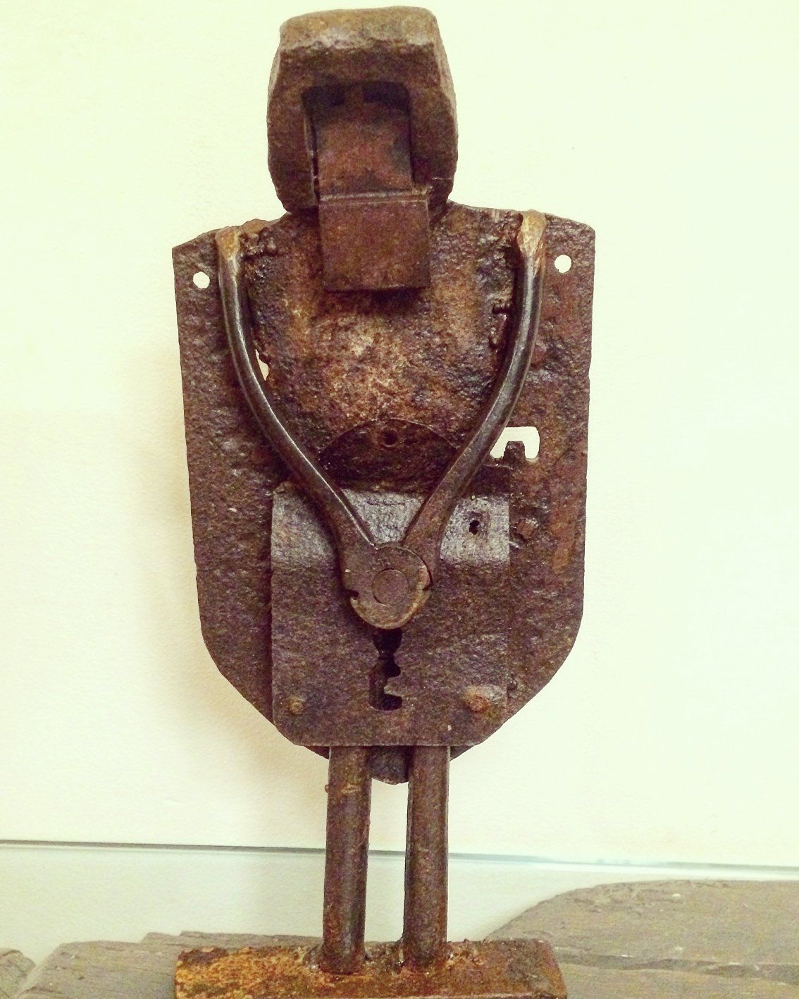Iron, wood, ceramics, glass and paper collage